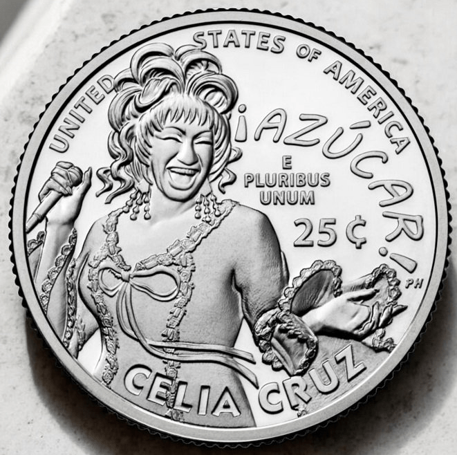 Una de esas noticias que parece que solo salen en verano y que mezclan curiosidad e intrascendencia fue que Celia Cruz, la gran dama de la salsa, había sido designada como una de las primeras mujeres en ver acuñada una moneda conmemorativa con su efigie. La Casa de la Moneda norteamericana designó a la cantante cubana como un icono cultural y una de las cantantes afrolatinas más importantes del país además de por su labor altruista. La moneda en cuestión era de 25 centavos de dolar y en el reverso figuraba su imagen siempre alegre junto a su célebre «azúcar».