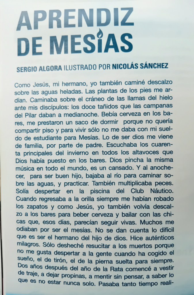 Cuarta de estas entregas sobre los textos del genial Sergio Algora redactó y publicó en la agenda-revista mensual zaragozana ZUM! El siguiente corresponde al mes de febrero del año 2008 y es un relato titulado «Aprendiz de Mesías» que venía ilustrado por Nicolás Sánchez. De nuevo la religión tiene un papel importante pero esta vez tratada con un humor socarrón y surreal del que Algora era un experto. Los bares, Dios y el cielo,la ciudad del Ebro y Norman Bates se citan y se mezclan en el mejor de los 4 textos que en Rebuscando en el Pasado han aparecido.