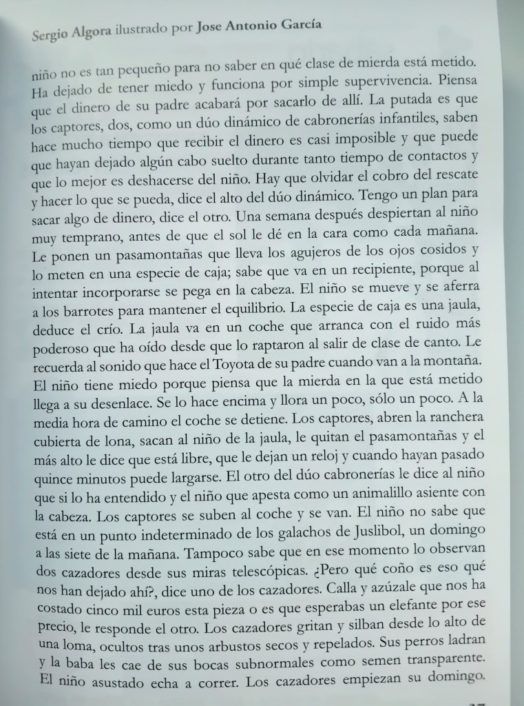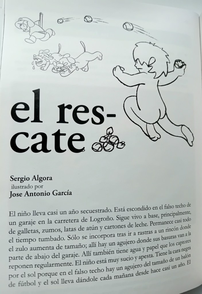 Quinta y última entrega de las colaboraciones y textos que el escritor y músico Sergio Algora realizó para la agenda mensual zaragozana ZUM!, correspondiente al mes de marzo del año 2008. Es posible que exista alguna más pero en mi baúl de recuerdos no existen más números de ZUM! Además, la repentina desaparición de Algora unos meses después, en el mes de julio, truncó una variada y prolífica carrera. El texto, titulado «El rescate», viene acompañado de la ilustración de José Antonio García, tiene un humor muy negro y un desenlace inesperado para una historia que parece sacada de la América profunda. Disfrútenlo que es el último, que pena.
