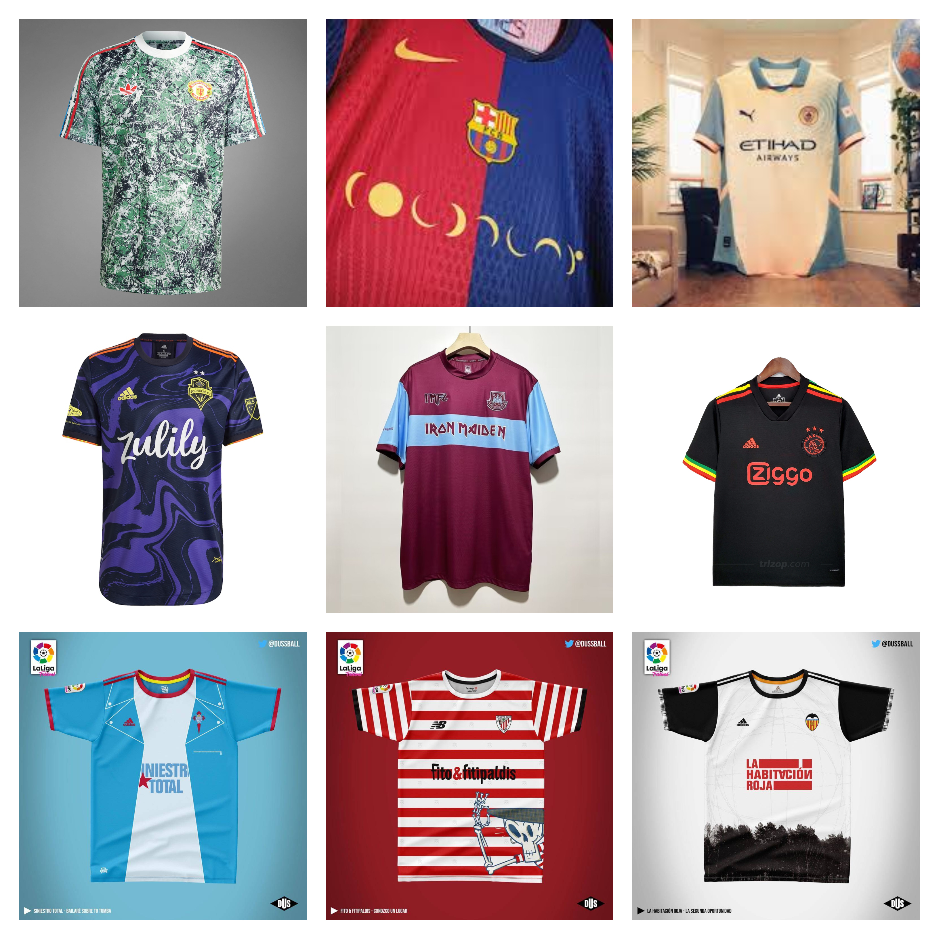 Otros clubs que adoptaron a artistas musicales a sus camisetas fueron el Ajax de Amsterdam que inspiraron una de sus equipaciones en Bob Marley y la música jamaicana. Volviendo a la liga inglesa, Ed Sheeran también colaboró con las camisetas de la tercera equipación del Ipswich Town en las que podía verse el logotipo de su gira. Otro equipo inglés, el West Ham, creo una camiseta especial con el nombre de Iron Maiden en el centro. En la liga americana los Seatle Sounders rindieron un pequeño homenaje al álbum «Purple Haze» de Jimi Hendrix (nacido en esa ciudad) con una camiseta púrpura que se vendió como churros. En 2017 el club emblema de Francia, el París Saint Germain también se alió con los Rolling Stones para una serie de artículos (de camisetas a gorras e incluso patinetes) con el famoso logo del grupo. Y aunque se trate solo de una idea que no ha llegado a plasmarse, aquí en España me quedo con la iniciativa del diseñador Pepe Dus (un gran futbolero) que unió a 9 grandes equipos de la Liga Española con otros tantos grupos de esas mismas ciudades. Así unió al Atletic de Bilbao con Fito y los Fitipaldis, al Atlético de Madrid con Joaquín Sabina, al Barcelona con Love of Lesbian, al Betis con O’Funkillo, al Celta de Vigo con Siniestro Total, al Deportivo de la Coruña con Xoel López, al Real Madrid con Vetusta Morla, al Sevilla con El Arrebato y al Valencia con La Habitación Roja.