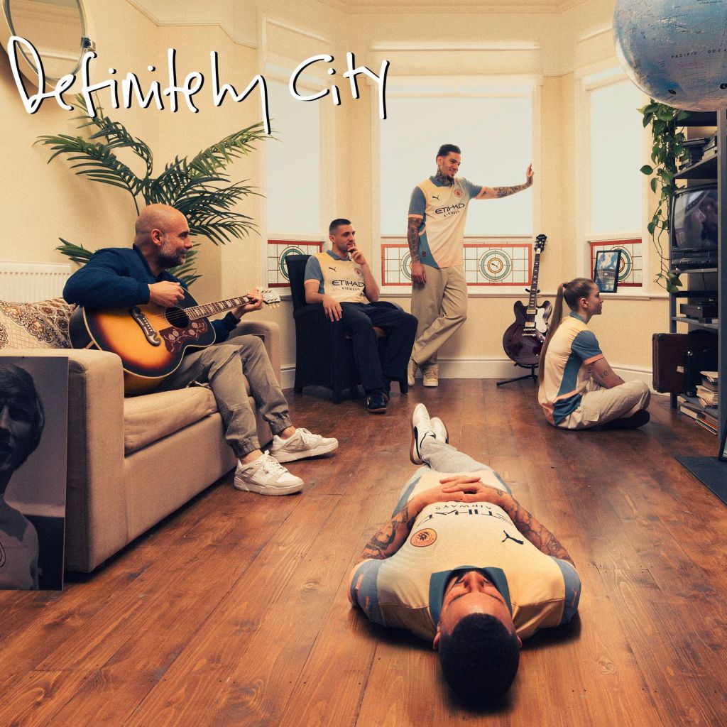 Pero no ésta no ha sido la única. Hace solo unos meses el F.C. Barcelona se unía el grupo Coldplay (gracias al patrocinador del club, Spotify) en una iniciativa benéfica a favor de Acnur y una fundación del Barça con una camiseta en la que se veía el nombre del grupo con la estética del nuevo álbum de Coldplay «Moon» y que lucieron en el partido que el equipo jugó contra el Real Madrid (el año anterior habían hecho algo similar pero con los Rolling Stones). Y volvemos a Manchester pero esta vez al equipo rival del United, el City que dirige Guardiola. A comienzo de la presente temporada presentaron una nueva equipación codiseñada (ejem) por Noel Gallagher del grupo Oasis (fans a muerte del Manchester City), justo cuando se anunciaba la reunión del grupo después de 15 años de su separación. Para la presentación de la equipación varios jugadores del club y hasta Guardiola emularon la portada del álbum «Definitely maybe» de Oasis que cumplía 30 años, aquí Definitely City