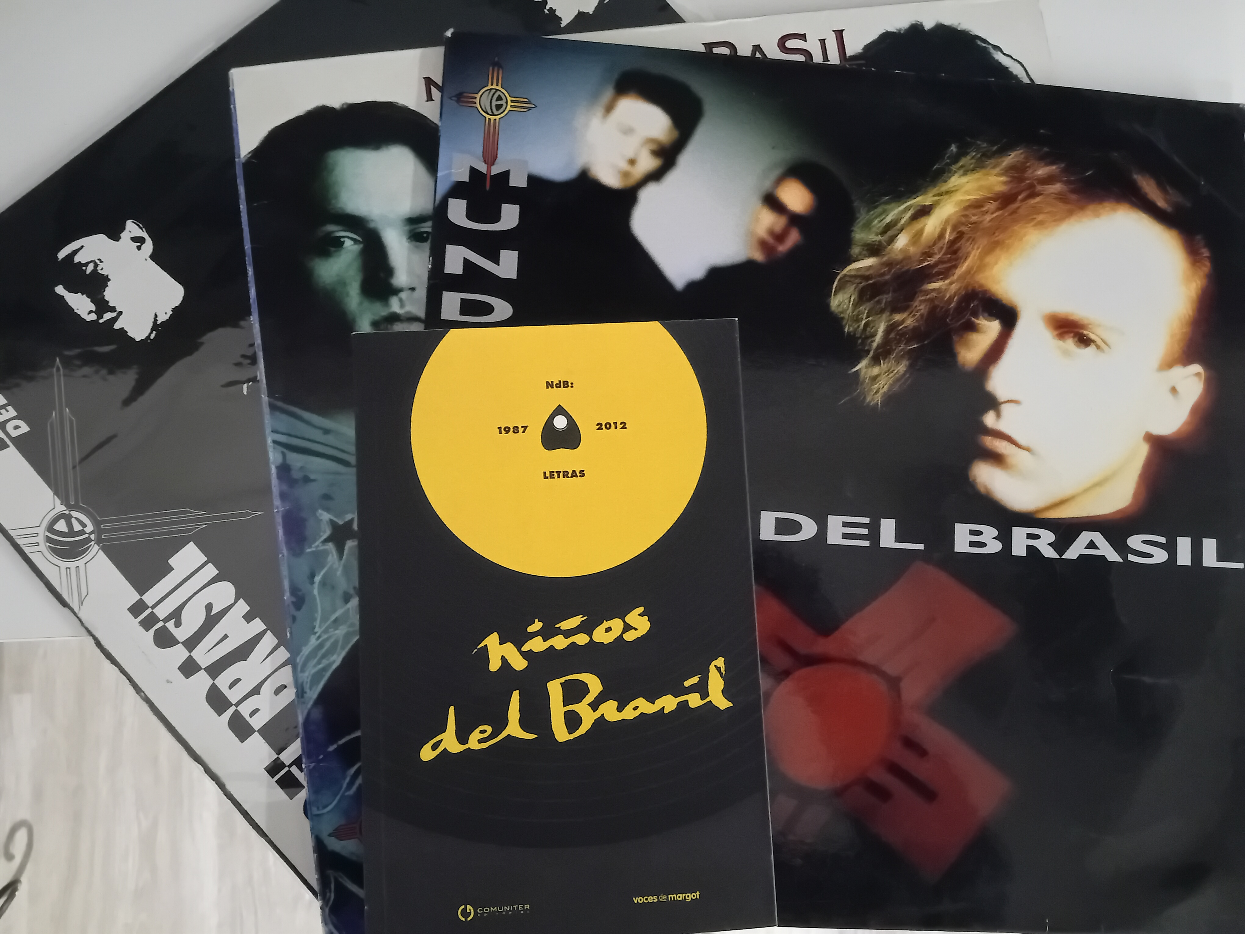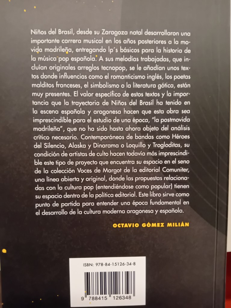 Hay grupos y personas que parece que siempre están ahí, incombustibles, llenos de ilusión por lo que les gusta, con buena cara para todos, casi siempre activos. Dos de esas personas se cruzan aquí en este libro. Uno el editor del libro, Octavio Gómez Milián, poeta, escritor, cantante, plumilla, coleccionista y mil cosas más. El otro Santi Rex, cantante de Niños del Brasil, activista musical, pinchadiscos y amigo de todo el mundo. En este libro publicado en 2012 por Comuniter (Voces de Margot) ambos se juntan para recopilar las letras de las canciones de uno de los más importantes y veteranos grupos zaragozanos en un texto que se puede leer fácilmente como un poemario o un pequeño libro de relatos minúsculos donde se ve la fuerza compositora de un Rex en algunas letras profundas, emocionales y viscerales que abarcan la carrera de Niños del Brasil desde sus comienzos hasta la fecha de edición. No pasa el tiempo por ellos, por los artífices del libro, como tampoco por las canciones de este gran grupo. Aún se puede comprar para el que le interese.