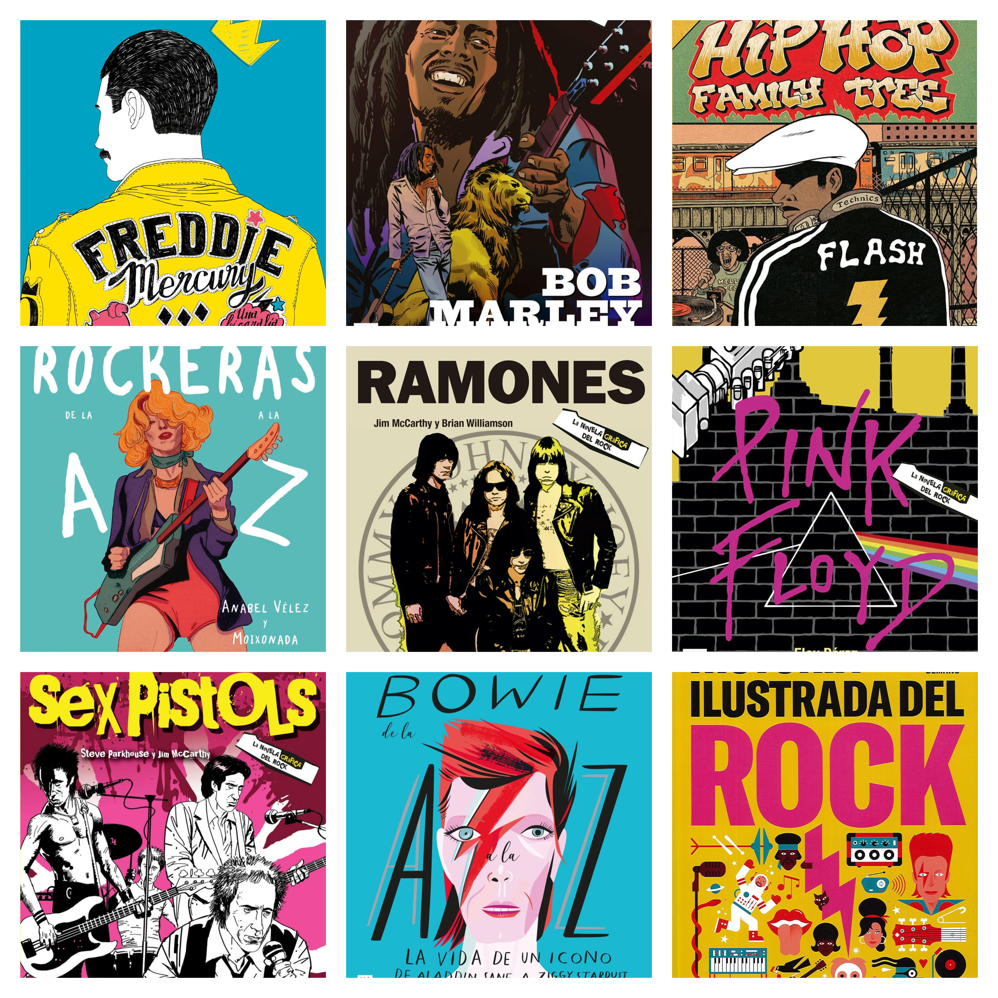 De Queen y su cantante Freddy Mercury existen (creo) hasta 3 libros ilustrados distintos. Éste de la imagen corresponde al creado por Alfonso Casas para la editorial Random. El de Bob Marley está editado por Ma Non Troppo y su autoría corresponde a Jim McCarthy y Benito Gallego. El tercero es la historia ilustrada del rap, una impresionante trilogía en gran formato de la editorial Flow Press. El cuarto repasa los principales nombres femeninos del rock en un hermoso libro obra de Anabel Vélez y Moixonada también para Ma Non Troppo, como también lo son los cuatro siguientes, dedicados a Los Ramones, Pink Floyd y Sex Pistols respectivamente, junto al bonito y naif repaso a la vida de David Bowie. El último es el más general de todos pues Susana Monteagudo y Luis Demano compilan la historia de la música moderna en un volumen editado por Litera. Seguiremos…